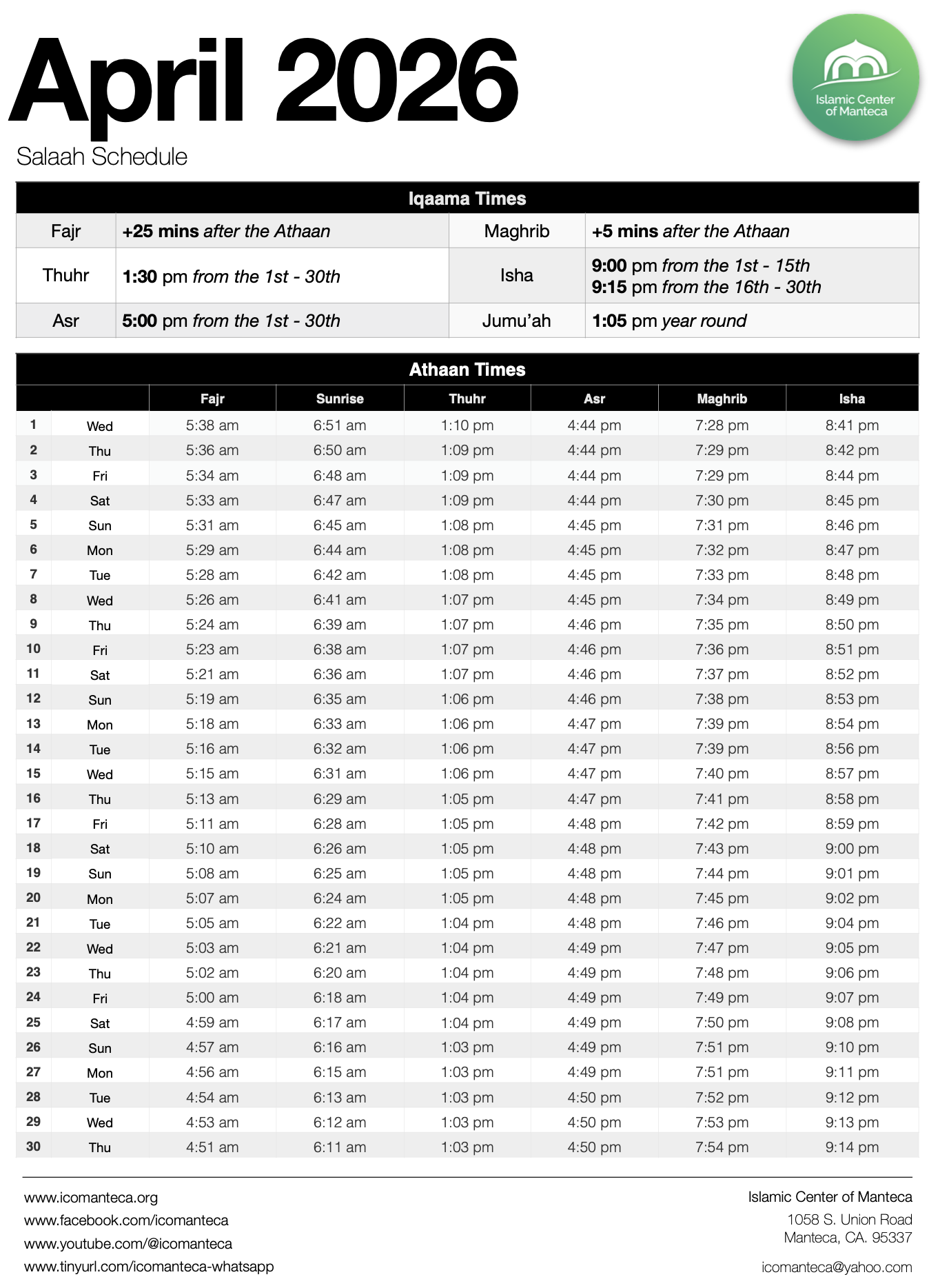 Prayer Schedule